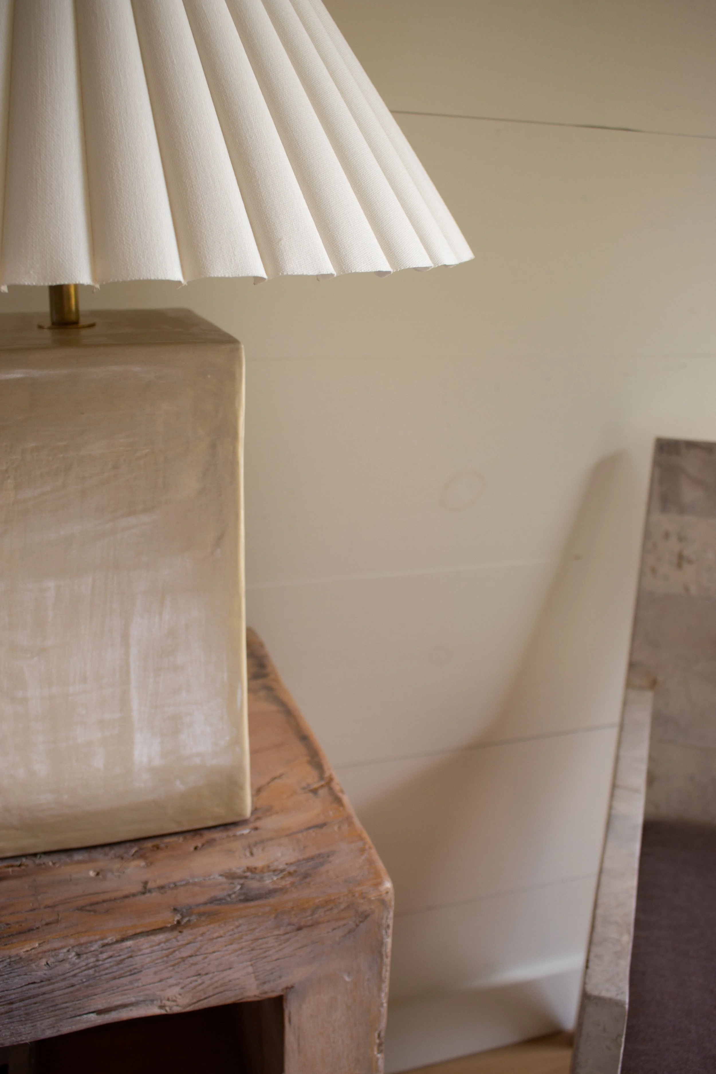 Stoneware lamp base, glazed in a matte ivory finish. Finished with brass hardware and a linen cloth cord.